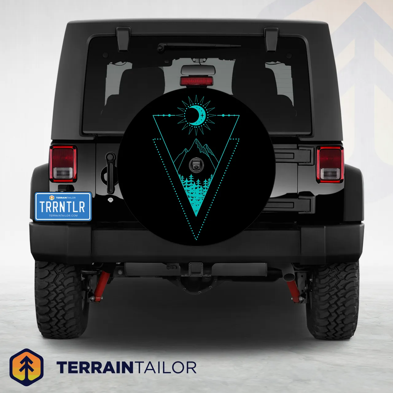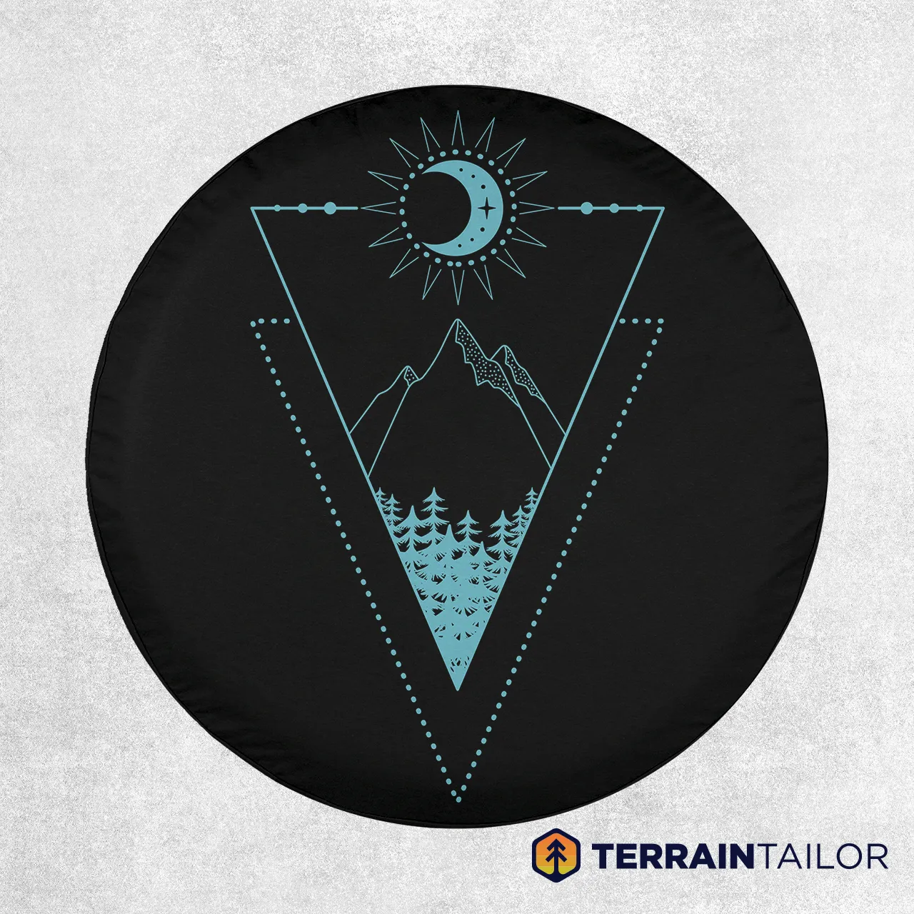 This spare tire cover features a clean, modern take on outdoor artwork. A thin-line geometric frame forms a pointed triangle that draws the eye toward a mountain silhouette rising above a dense pine forest. Above the scene, a crescent moon sits inside a stylized sunburst, adding a celestial touch without overpowering the design. The soft teal linework stands out sharply against the black background, giving the whole piece a crisp, minimalist look.