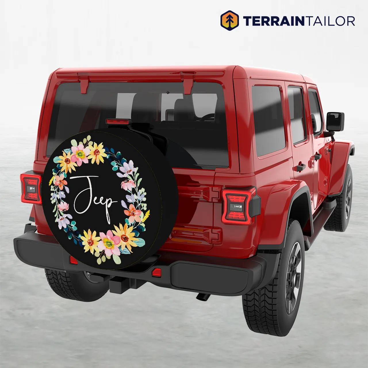 It features a soft watercolor floral wreath surrounding a hand-lettered “Jeep,” giving it a bright and simple look. Printed on durable, weather-resistant material, it protects the spare tire from sun, rain, and debris while adding a clean decorative touch.