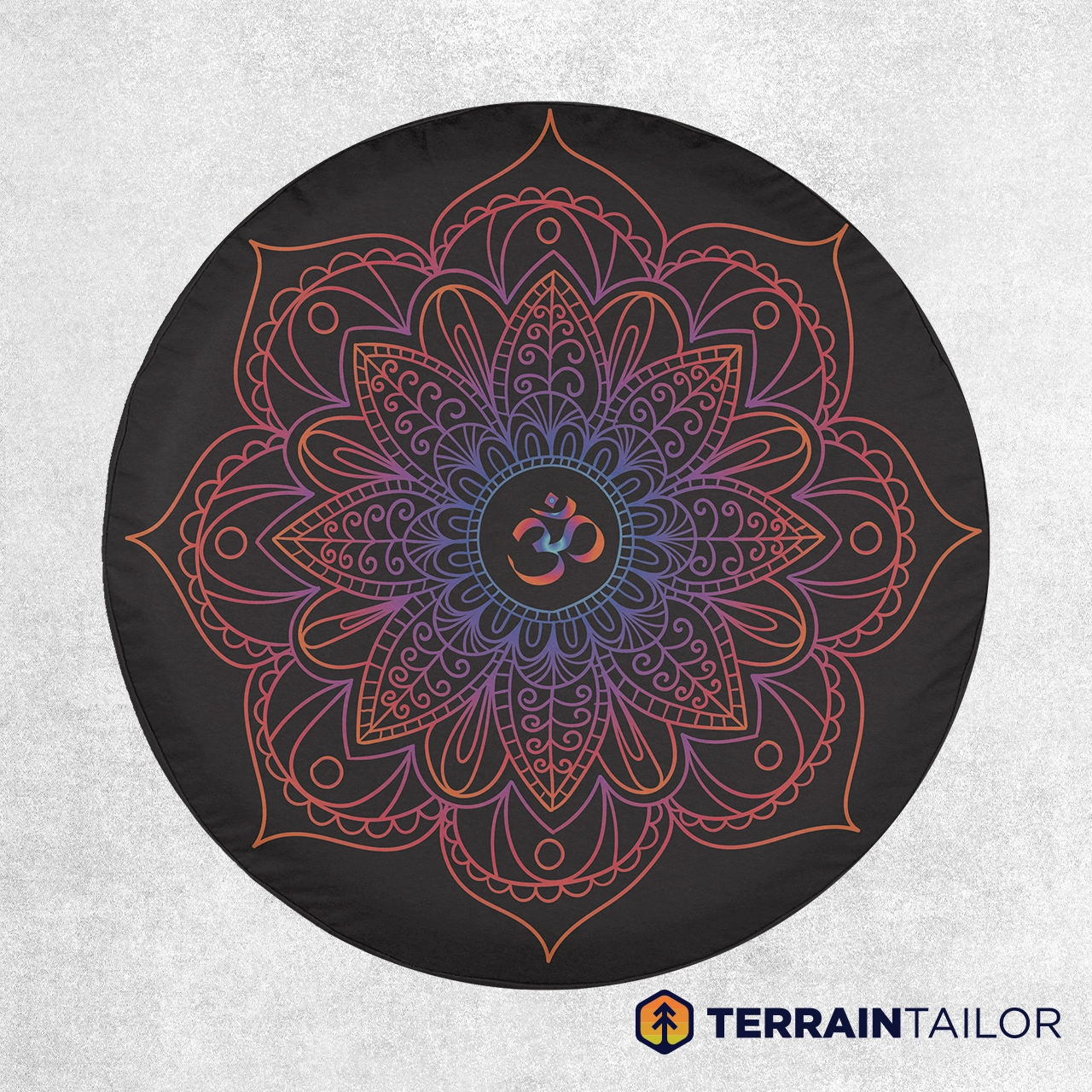 This spare tire cover features a detailed mandala design with clean linework and a smooth gradient that shifts from warm orange to deep purple. The pattern is centered around the “Om” symbol, creating a calm, balanced look that fits well with outdoor lifestyles, yoga themes, and anyone who likes bold but peaceful artwork.