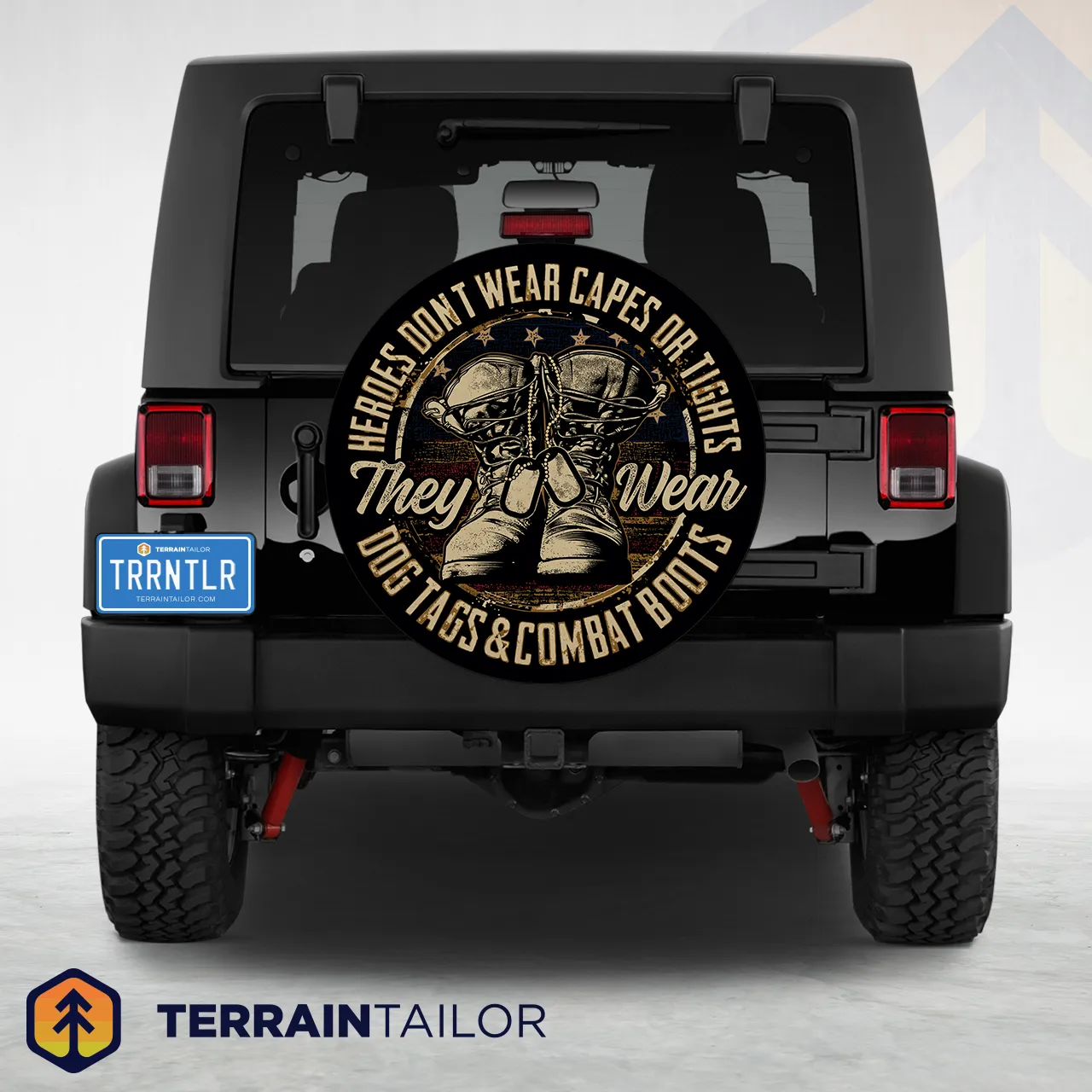 The Heroes Wear Combat Boots spare tire cover honors those who serve. The design features a pair of worn combat boots with dog tags, set against a distressed American flag background. Bold lettering reads, “Heroes don’t wear capes or tights. They wear dog tags & combat boots.”