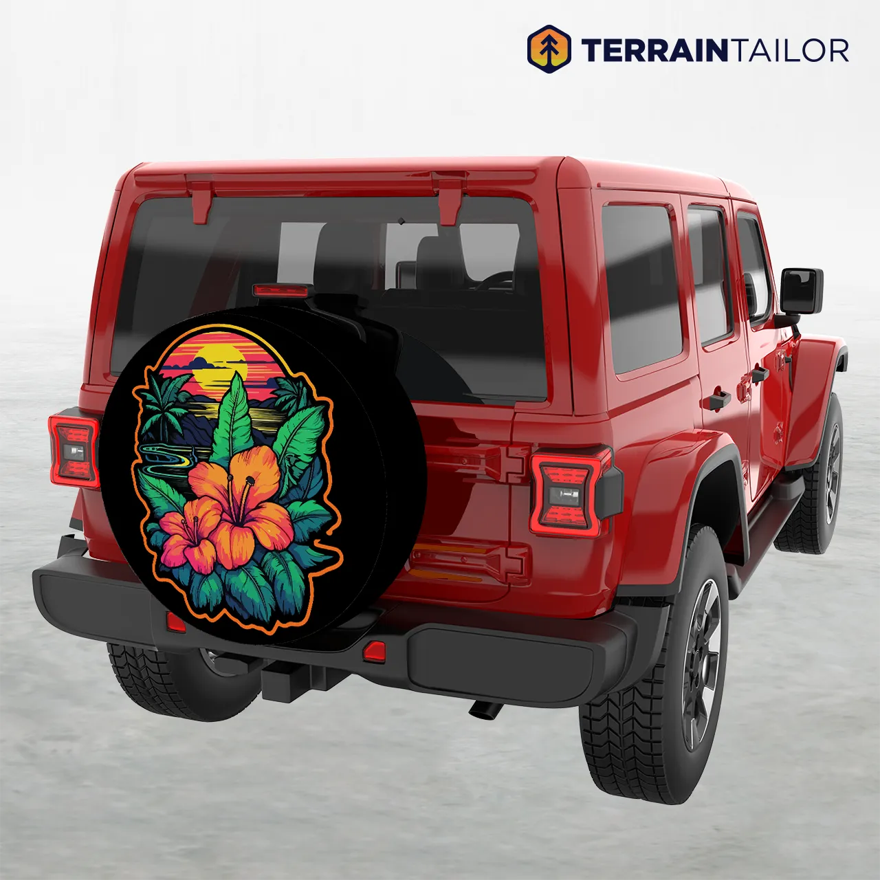 The Hibiscus Sunset spare tire cover brings bold tropical color with a relaxed island feel. The design features vibrant hibiscus flowers layered over lush greenery, framed by a sunset with palms, water, and distant hills. The black background makes the colors pop and gives the cover a clean, finished look.