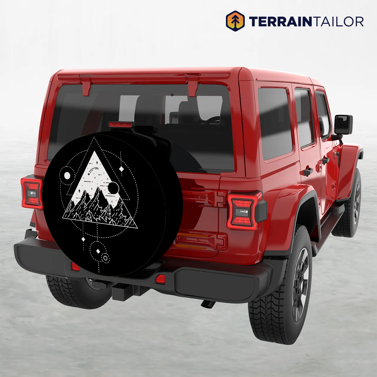 This design mixes sharp geometric shapes with a clean mountain skyline and orbit-style detailing. The simple line work gives it a sleek, modern feel while the circular layout keeps it balanced and eye-catching on the road.
