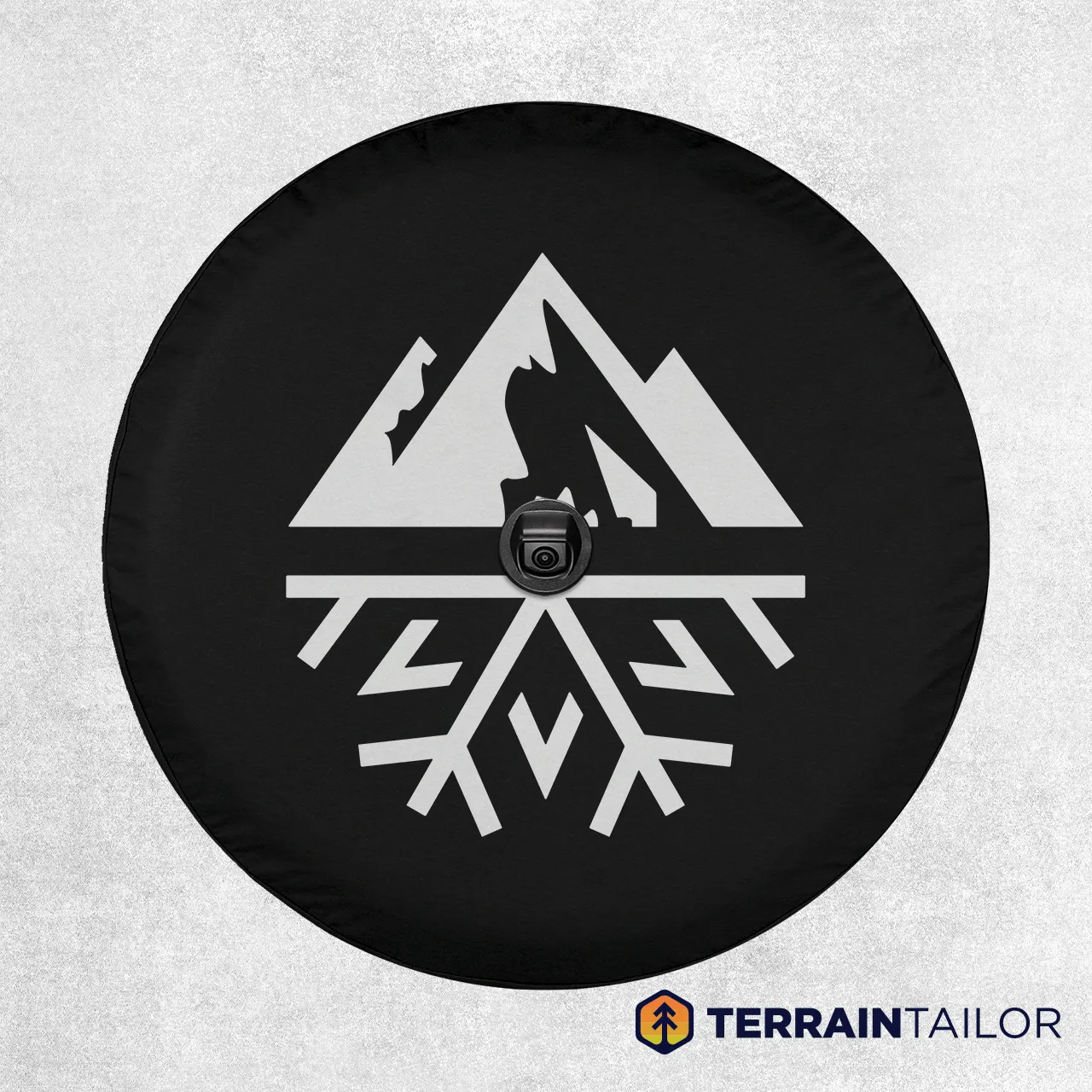 This design combines rugged mountain shapes with a snowflake symbol. It represents adventure in all seasons. The geometric layout keeps the look sharp and modern.