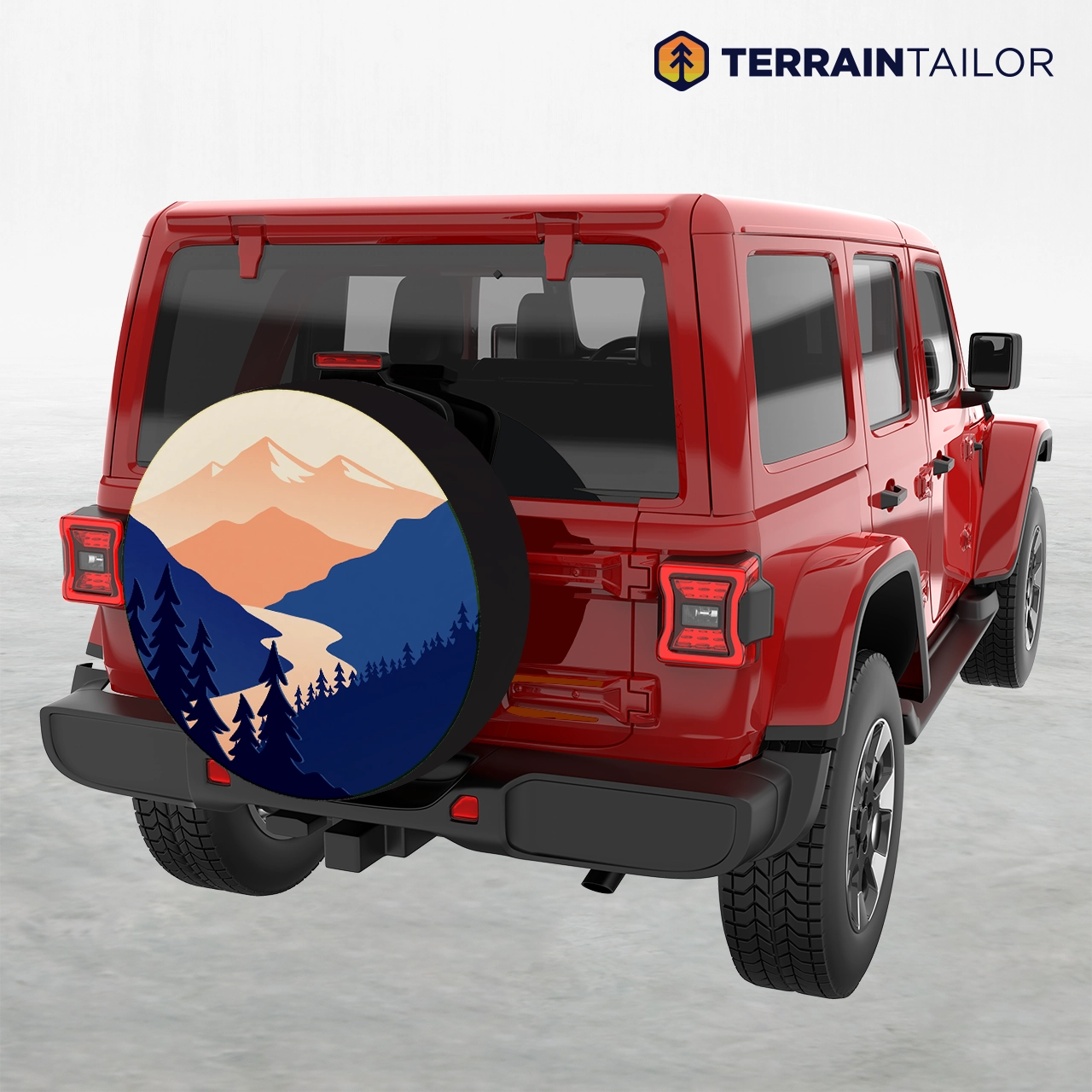 This spare tire cover features a calm mountain scene with soft, layered colors. The design shows rolling blue hills, warm-toned mountains, and a winding river framed by tall pines. The simple, flat style keeps it clean while still giving a sense of depth and movement.