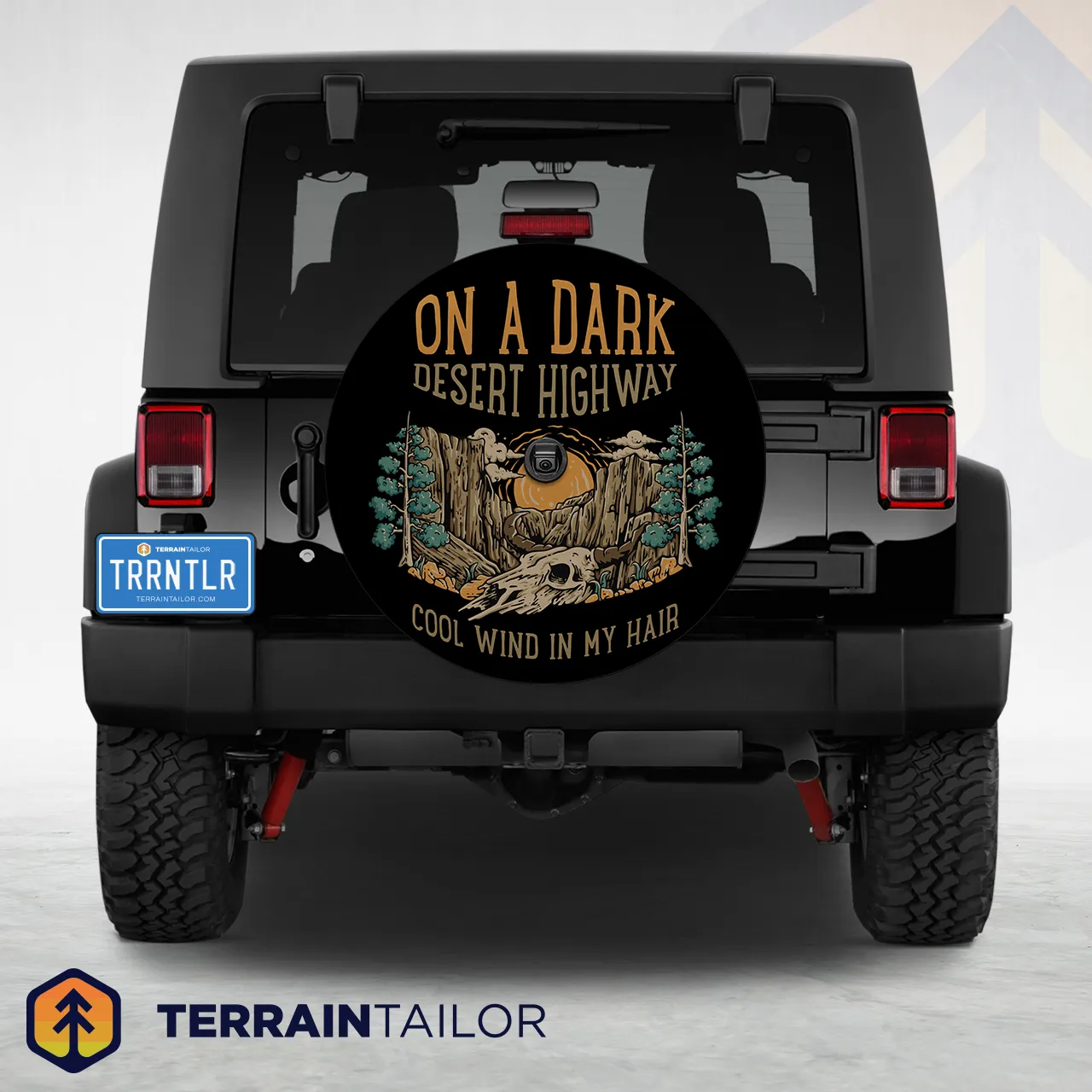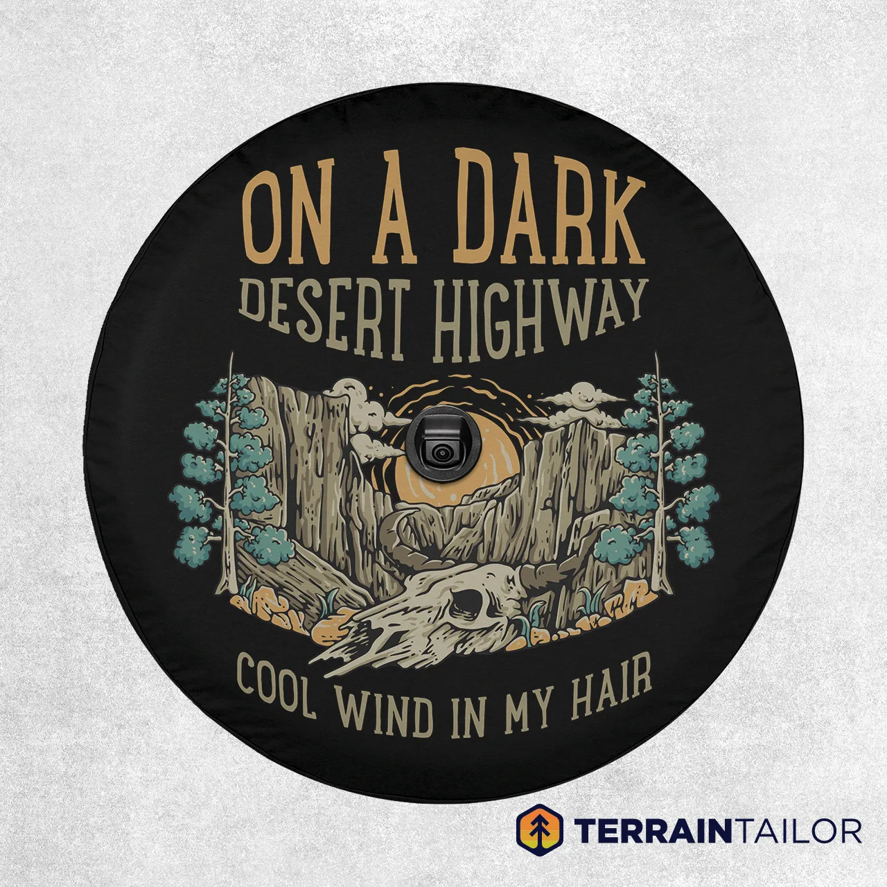 This design captures the quiet pull of the open road at night. A desert canyon scene sits beneath a glowing moon, paired with the iconic lyric “On a dark desert highway, cool wind in my hair.” It feels nostalgic and reflective, made for long drives, empty highways, and moments when the journey matters more than the destination.