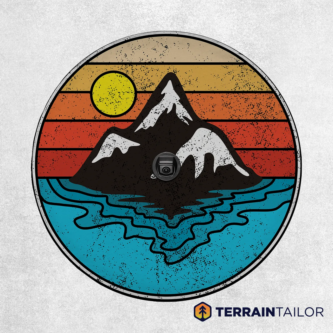 Mountains. Water. Open space. This design blends rugged peaks with calm blue water, set against warm retro stripes and a rising sun. It has a vintage outdoor feel that fits Jeeps, SUVs, and overland rigs that live for the next horizon.