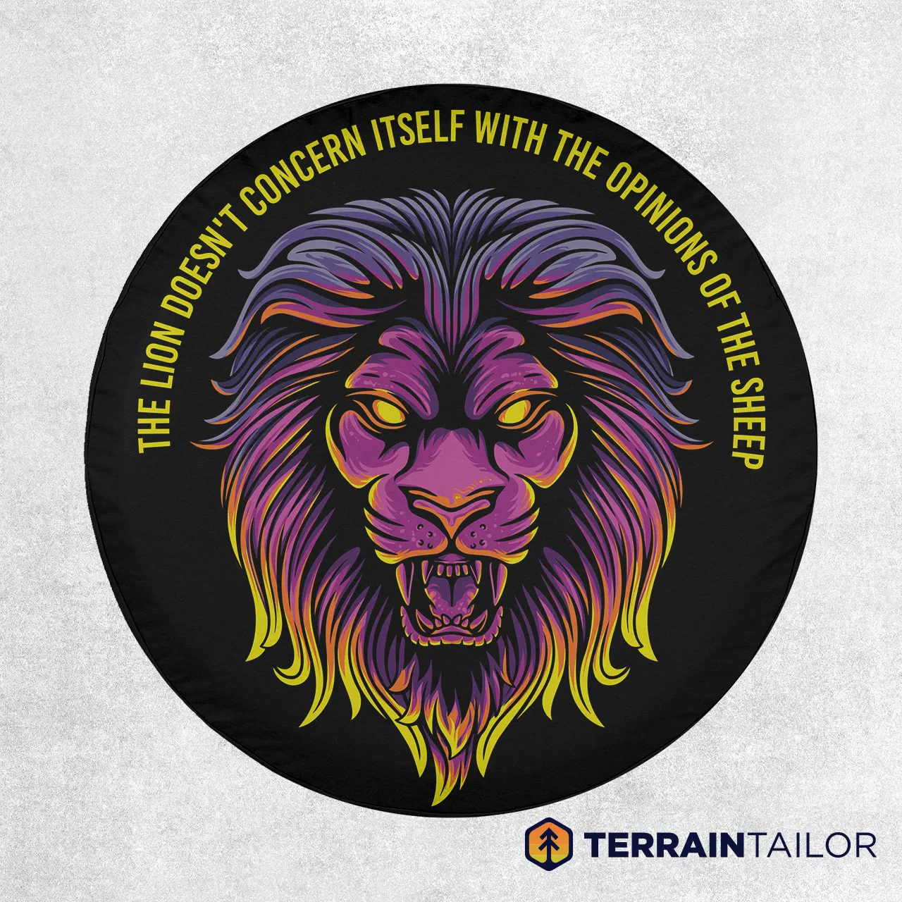 This spare tire cover features a bold, illustrated lion head with a fierce expression and a flowing mane in layered shades of purple, orange, and yellow. The colors give the artwork a neon, high-contrast look that stands out against the black background. Arched across the top is the phrase “THE LION DOESN’T CONCERN ITSELF WITH THE OPINIONS OF THE SHEEP,” creating a strong, confident theme that matches the artwork’s intensity.