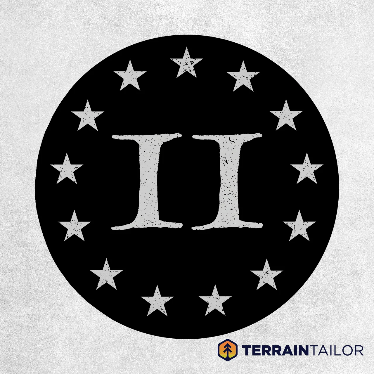 This minimalist design centers around Roman numerals surrounded by a ring of stars for a clean, striking look. Subtle distressing adds character without overpowering the design. It pairs well with blacked-out or monochrome vehicle builds. A timeless option for drivers who prefer simple symbolism.