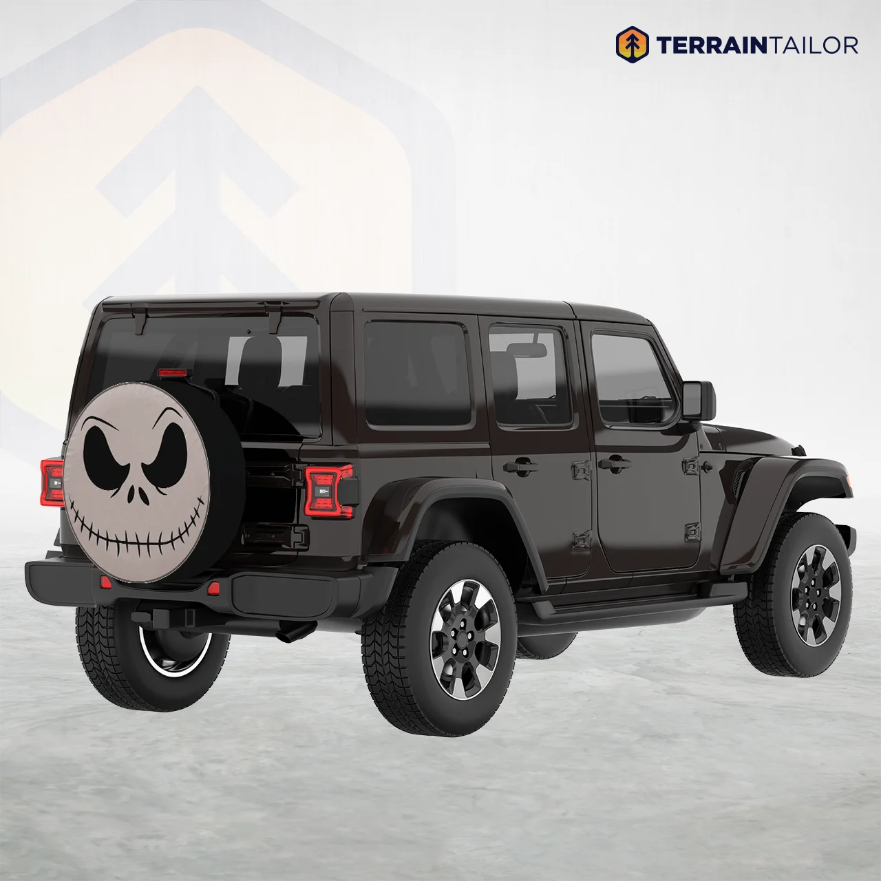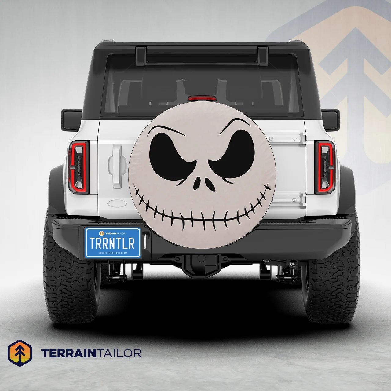This tire cover features a bold black-and-white skeleton face with a stitched grin and expressive eyes. The clean, high-contrast artwork gives your spare tire a fun but edgy look that stands out on the road.