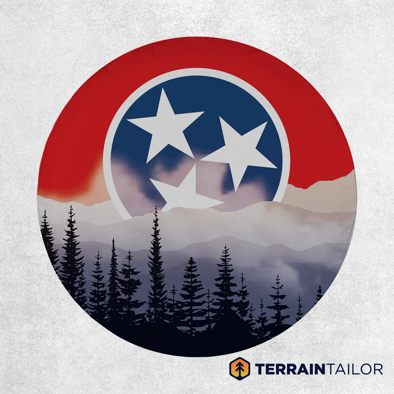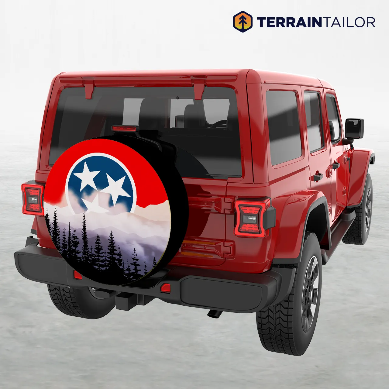 Quiet, familiar, and rooted in the outdoors. This Tennessee Mountain Home spare tire cover blends the iconic tri-star flag with soft mountain layers and a pine forest silhouette. The result feels calm and grounded, with a strong sense of place.