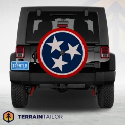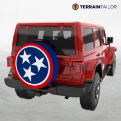 This spare tire cover features the iconic Tennessee Tri-Star emblem, a symbol that represents the state’s three distinct regions—East, Middle, and West Tennessee. The design is clean and bold, with crisp white stars set inside a deep blue circle and framed by a bright red outer ring. The simple color palette gives it a classic look that stands out without feeling busy.
