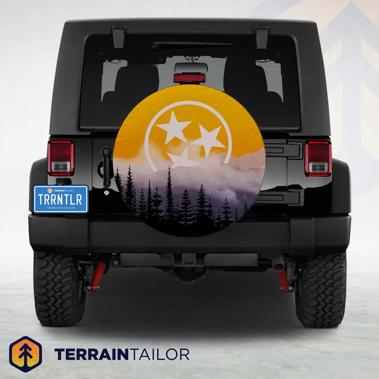 This design places the Tennessee tri-star over a moody forest and mountain backdrop. The layered mist and dark tree line add depth without feeling heavy. It delivers a clean balance of state pride and outdoor style. A solid choice for drivers who want something subtle but meaningful.
